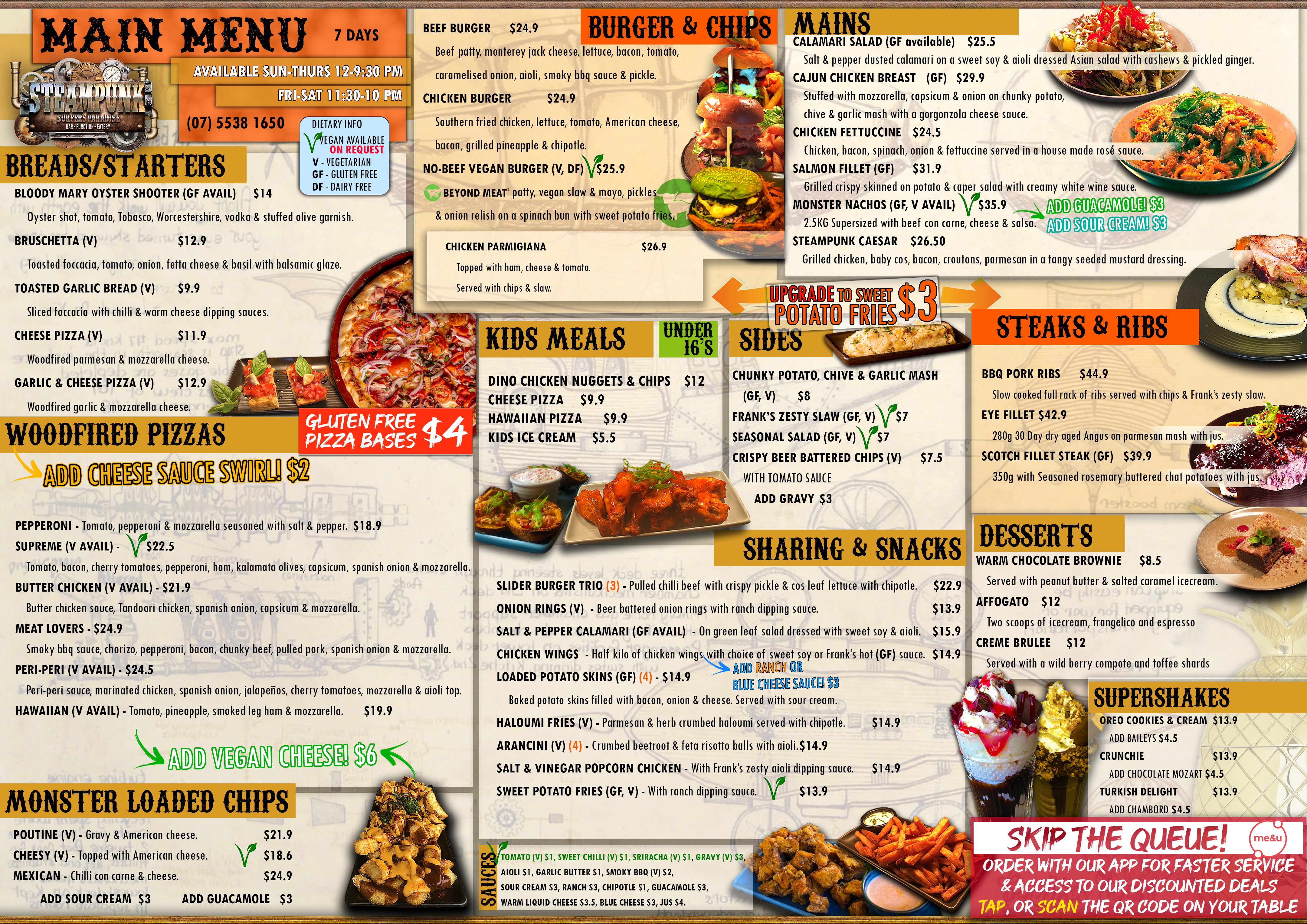 “Ordered a wood fire pizza, 3 shared plates and two cocktails between the two of us and it's safe to say that we got way more than we had bargained for! We had our food and cocktails in front of us within 10-15 minutes of sitting in our neat Victorian booth and were always greeted by super friendly staff sporting really awesome get-ups. Highly recommend visiting here, as I sure will be time and time again. The theming, the food and the service are all beyond imagination. I'm sure I'll be back for many more Pegasus Rage cocktails to come!”